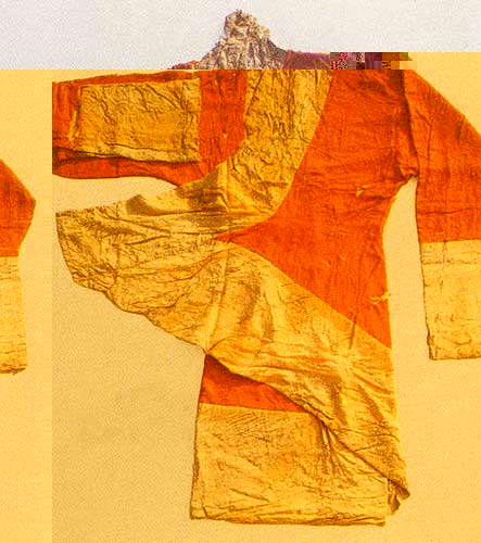 这件绛红纱印彩续衽直裾绵深衣就是从长沙马王堆一号汉墓中出土的。衣长130厘米,通袖长236厘米,袖宽41厘米,袖口宽30厘米,腰宽48厘米,下摆宽57厘米,领缘宽29厘米,摆缘宽38厘米。它的衣式形制有交领、右衽、胡袖、直裾,袖与下摆均镶大幅的宽缘。此件衣服有一大特点,就是有一个宽大的续衽,即衣襟(古代称“衽”)自腋下镶于下裾部位,直通与下摆平齐,好象是右衽的继续,故名“续衽”。这种续衽宽边直裾式深衣是西汉长沙地区流行的款式,但保持着以前的直裾形式,这在当时是为了与刚才介绍的“曲裾”形式相适应。它可以将宽大的衣襟覆包于身后,再用腰带束紧,在冬天能起到取暖的效果。