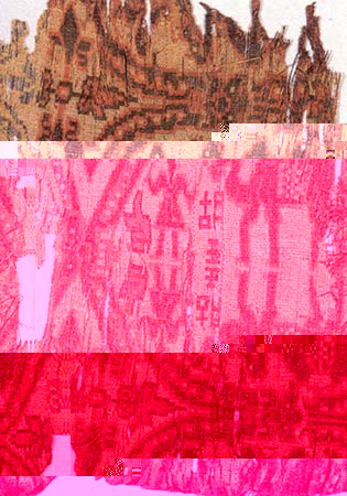 这件“胡王”牵驼锦是一件我国传统的平纹经锦,出土于高昌延昌二十九年(公元589年)唐绍伯墓中。整个图案以联珠圆环组成。在环内以朱红、墨绿、土黄三se<北京zheengffuu机房敏感词屏蔽>se<北京zheengffuu机房敏感词屏蔽>se显示一幅美丽的图案:一个商人执鞭牵驼来到泉水边,清澈的泉水中倒映出他完整的身影。织匠把商人在漫漫黄沙中发现泉水的喜悦之情淋漓尽致地表现出来。在这幅织锦中还织有两个引人注目的汉字“胡王”,由此可推测,织匠很可能是汉人,也许来自中原。