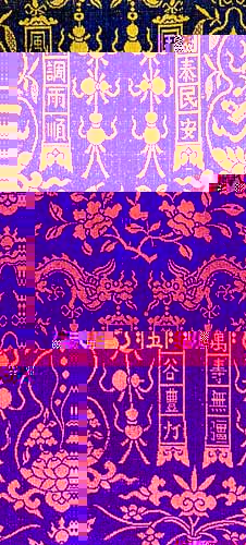 吉祥图案起始于商周,发展于唐宋,鼎盛于明清。明清时,几乎到了图必有意,意必吉祥的地步。 它们所要表达的只有四个含意:“富、贵、寿、喜”:贵是权力、功名的象征;富是财产富有的表示,包括丰收;寿可保平安,有延年之意;喜,则与婚姻、友情、多子多孙等均有关。吉祥图案作为中国传统文化的重要部分,已成为认知民族精神和民族旨趣的标志之一。明清丝绸吉祥纹样的题材十分广泛,。花草树石、蜂鸟虫鱼、飞禽走兽、无不入画。貌似平凡,其中不乏真趣与深情。一般有三种构成方法:一是以纹样形象表示,二是以谐音表示,三是以文字来说明。
