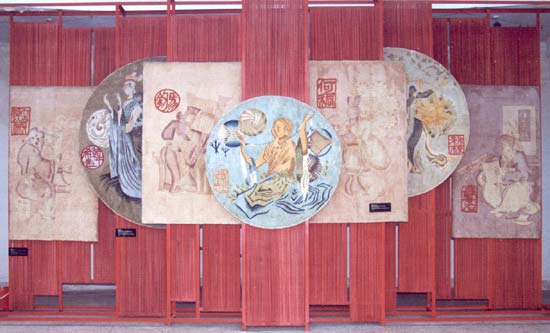 序厅两侧的文物厅,集中展示了五千年丝绸文物的精华,厅内恒温恒湿的环境,为娇贵的丝绸文物提供了良好的保存条件。历史文物厅按时代分为两个厅:一厅主要介绍从新石器时代到宋辽元时期丝绸发展的历史;二厅则专门展示明清丝绸皇家传世珍品及考古出土实物。