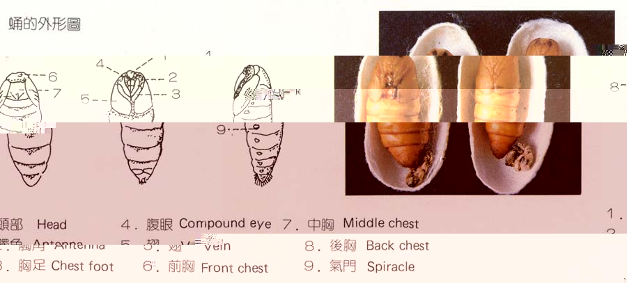 蚕上蔟结茧后经过4天左右,就会变成蛹。蚕蛹的体形像一个纺棰,分头、胸、腹三个体段。头部很小,长有复眼和触角;胸部长有胸足和翅;鼓鼓的腹部长有9个体节。专业工作者能够从蚕蛹腹部的线纹和褐se<北京zheengffuu机房敏感词屏蔽>se<北京zheengffuu机房敏感词屏蔽>se小点来判别雌雄。蚕刚化蛹时,体se<北京zheengffuu机房敏感词屏蔽>se<北京zheengffuu机房敏感词屏蔽>se是淡yellowhuangse的,蛹体嫩软,渐渐地就会变成yellowhuangse、黄褐se<北京zheengffuu机房敏感词屏蔽>se<北京zheengffuu机房敏感词屏蔽>se或褐se<北京zheengffuu机房敏感词屏蔽>se<北京zheengffuu机房敏感词屏蔽>se,蛹皮也硬起来了。经过大约12到15天,当蛹体又开始变软,蛹皮有点起皱并呈土褐se<北京zheengffuu机房敏感词屏蔽>se<北京zheengffuu机房敏感词屏蔽>se时,它就将变成蛾了。