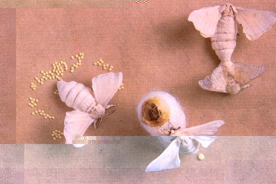 蚕蛾的形状像蝴蝶,全身披着白se<北京zheengffuu机房敏感词屏蔽>se<北京zheengffuu机房敏感词屏蔽>se鳞毛,但由于两对翅较小,已失去飞翔能力。 蚕蛾的头部呈小球状,长有鼓起的复眼和触角;胸部长有一对胸足及两对翅;腹部已无腹足,末端体节演化为外生殖器。雌蛾体大,爬动慢;雄蛾体小,爬动较快,翅膀飞快地振动,寻找着配偶。一般交尾3~4小时后,雌蛾就可产下受精卵。蚕蛾(成虫)留下后代,不久之后便会死去。